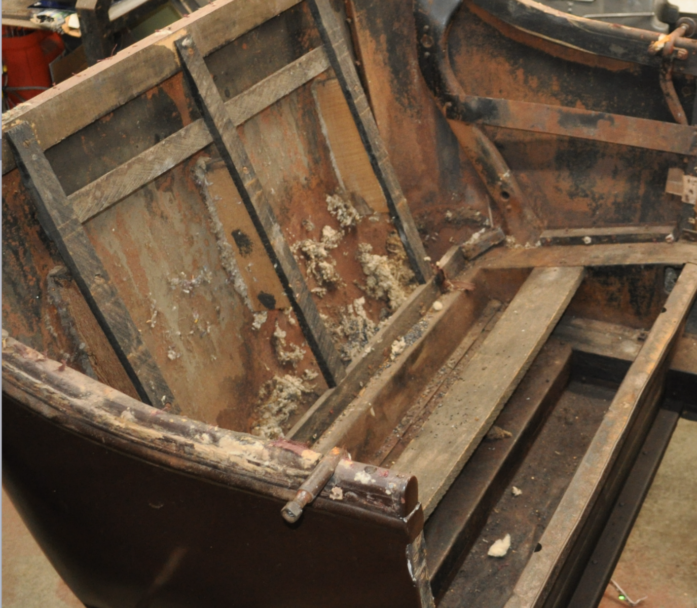 Don, when I was working on my T, the rear slats were screwed in at the top of the tub, and supported the tub's sheet steel via curved spacers as shown in the picture. The bottom looks to have been screwed in as well. I have know idea if this is correct, but I know I was the second person "in there" since the car was new.