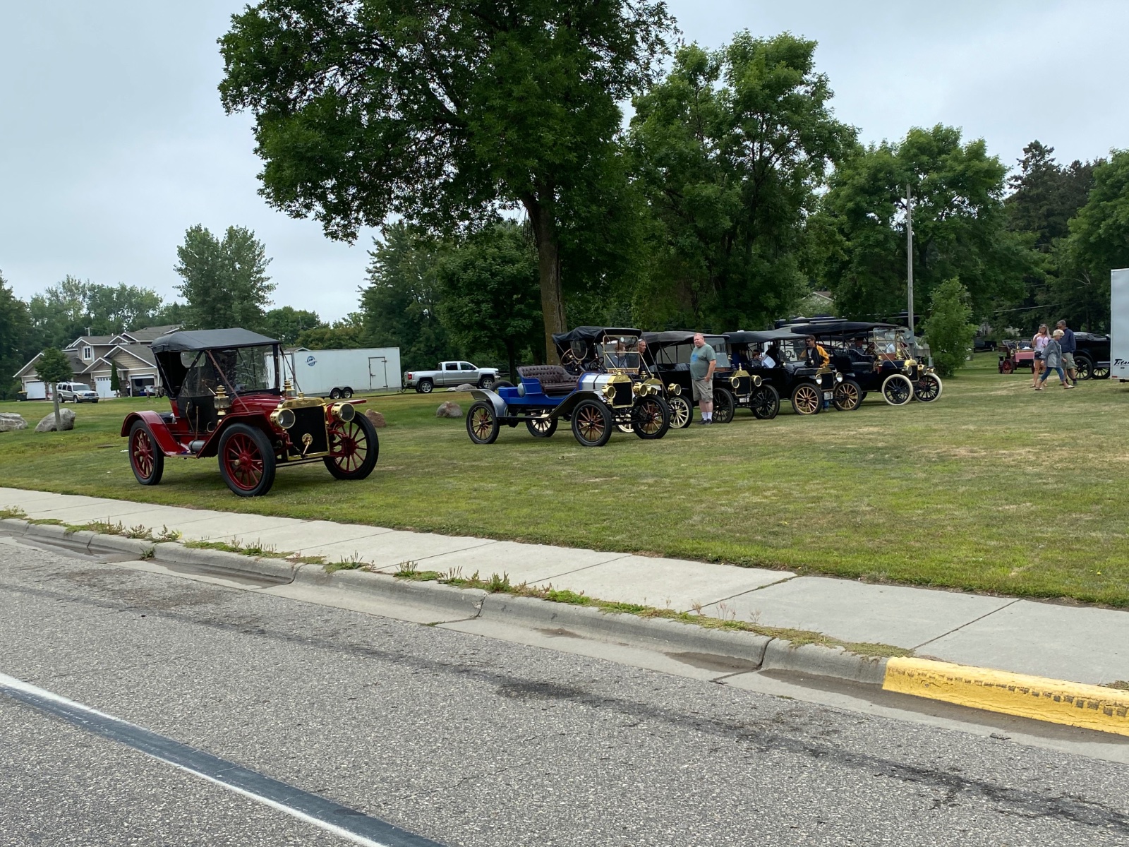 We’ve lost one car, but added several. Today (Friday) I believe we’re at 12 cars. Maybe 14 for tomorrow’s big run to Buffalo and back. We’ll be in New London at the American Legion later today if the rain lets up. Our Model T representation is up to four, 1914, 15 and 16, with a brass speedster joining us today or tomorrow.