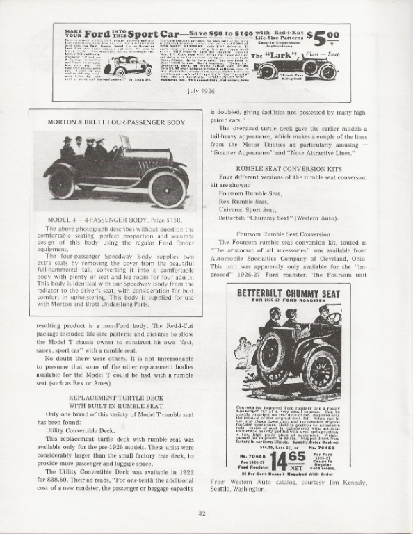 I have a 26 Roadster with a rumble seat. The rumble seat is not original equipment on the model T. The first Fords to have a rumble seat were Model A's. Someone who had this car before reversed the trunk lid and made it into a rumble seat. The upper part of the top was cut so that it could be opened or closed with the top down. I also cut my finger one time on a tour when it slammed down as I was reaching for a tool and spent a few hours in an ER getting it stitched back on. So now whenever I open it, I use a bungee cord to the spare tire.