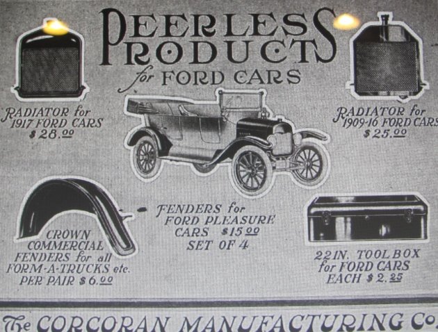 William Corcoran (brother of Thomas J) started Corcoran Manufacturing Co. They produced aftermarket products for Ford, Chev and others. One of their brands was "Peerless".