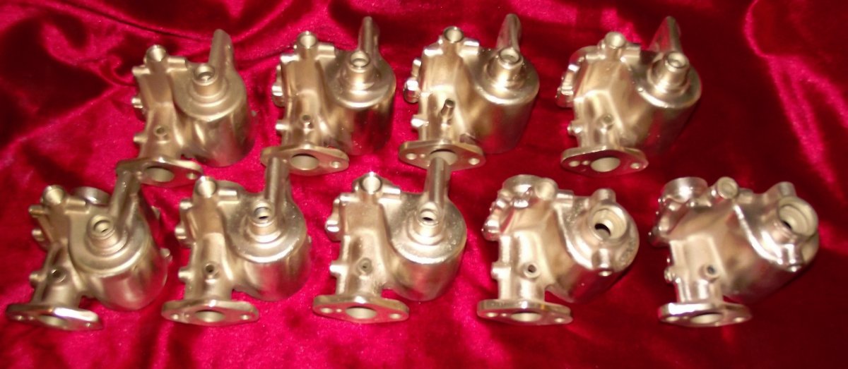 So I spent the day finishing two OF's and putting them in the mail. Should have taken a photo when I had 11 of them on the bench doing various machining processes to the mating surfaces on them. Had the other two in boxes before I thought to line them up and take pictures. So here are 9 Stromberg OF's that will be getting parts in and on them in the next few days. I've never had this many all at once before and probably never will again.