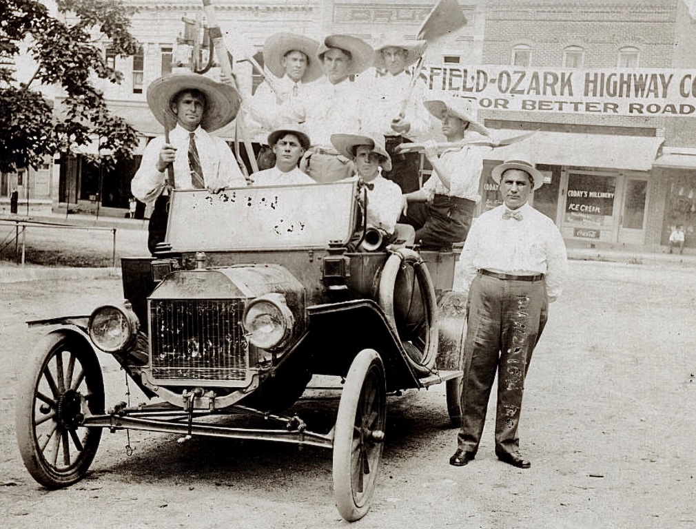 That was my first thought Allan, Must be another bridge right? Mud bogging has been around a long time. Maybe the guys repairing the tire had the same conditions? The roadster setting between the two touring cars, you sure can see how much narrower the top is. Can't imagine that many cars parked in one spot. I wonder what was going on, Ball game? Great bunch of photos Tom, thanks for sharing.