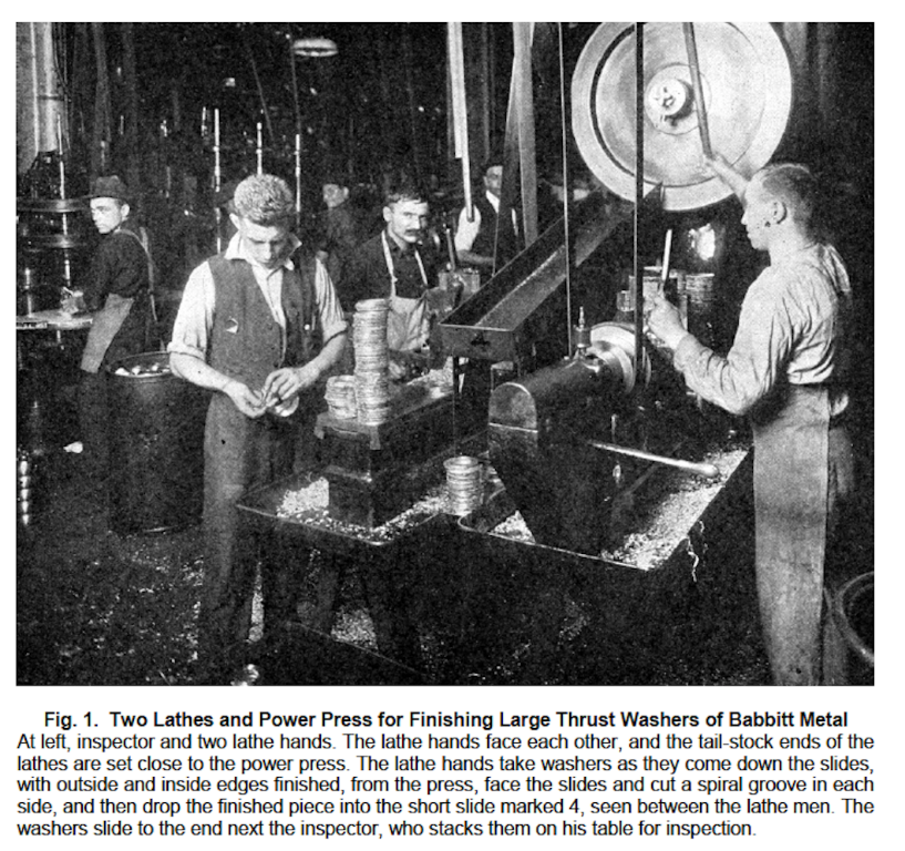 As the thrust washers were supplanted by bronze in 1915, we might confidently assume the early ones were indeed a true babbitt alloy. The clipping above showing machine methods on babbitt washers would seem to attest to this.
