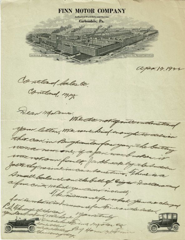 We do not quite understand your letter. We were kind enough to deliver this car in Binghamton for you. The battery was a new one. If a jar (?) was broken it was not our fault. Jars (?) break by the sudden jolt they receive in cars sometimes. There is a small balance on the bill of eight dollars a few cents, which you didn’t include.