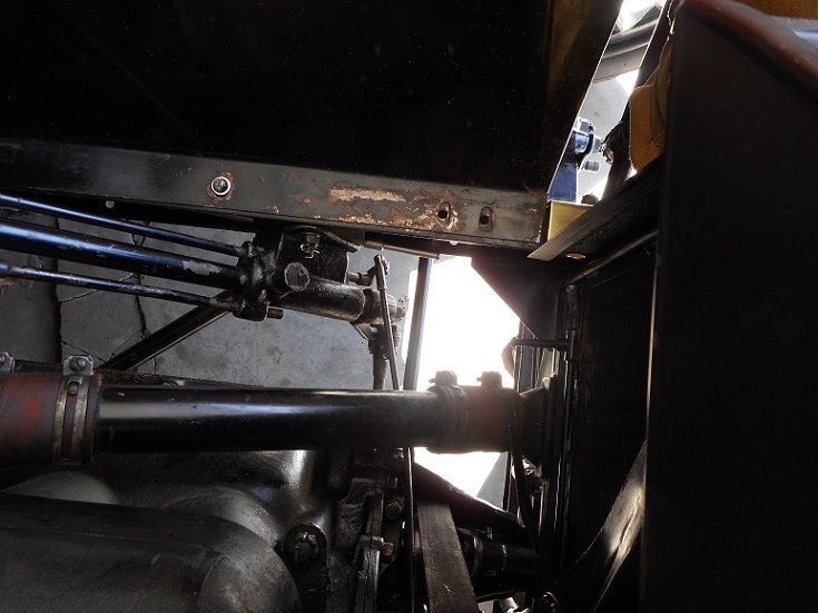 Ron Goceks kit didn't supply enough tubing for this job. A 13-14 takes 4 feet, with 3" left over maybe. I found 1/2" red rubber tubing from McMaster Carr. They delivered it in one day. Haven't had a chance to use it yet. I made the entire system from the Ford prints. I also have an original frame line, which is exactly like the Ford print. There is a hole in the frame just forward of the controller shaft for the support bracket.