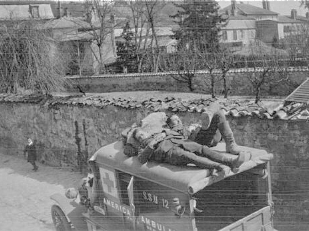 The ambulance is from the American Field Service, around 1915-16, an early model ambulance body, brass rad, acetylene lights.
