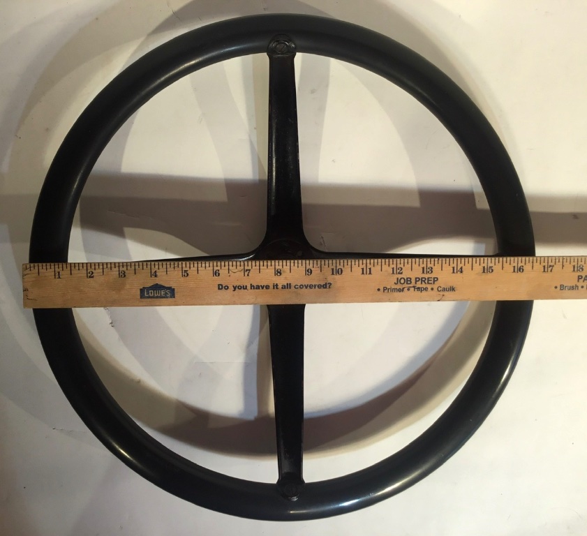 Malleable iron spider, painted black. 12-1/4” I.D., 1-3/8” thick) 14.59” O.D. wood rim painted black until about 1919, then made of “Fordite” composition material. The malleable iron spider was changed to the pressed steel design late in the era (date unknown)