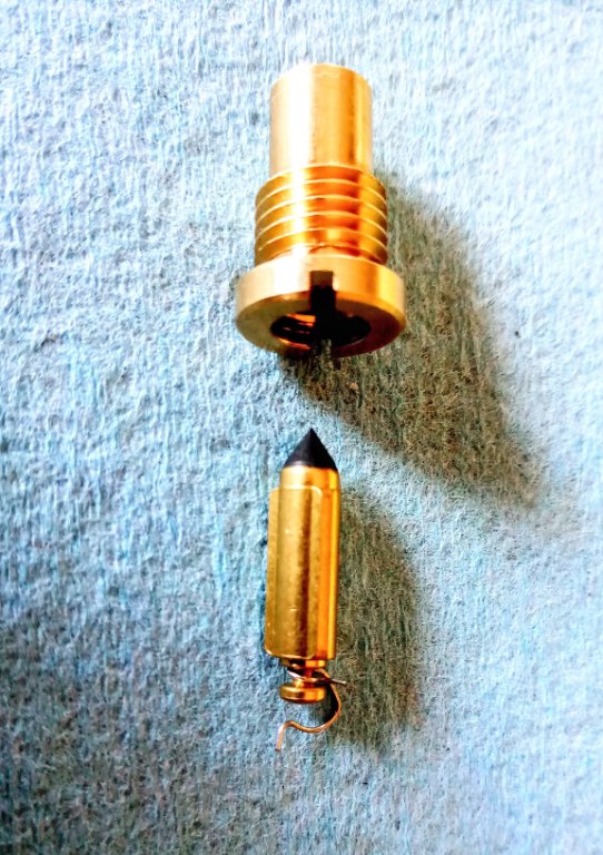 And here it is finished, with the old metal tip in the trash where it belongs, and is now sporting a custom Viton-tipped needle with a modern hook to "pull" it open (no more stuck-closed Viton tips).