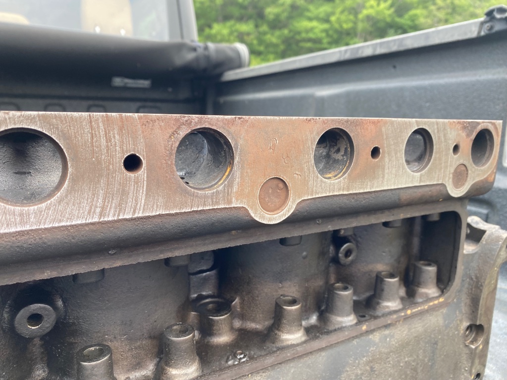 The engine is out of the 27 and the crankshaft has been removed….. it’s ready to be taken over to the machine shop to have the Babbitt removed and the engine block hot dipped…. Does anyone have a rough idea of how many thousands can safely be removed from the top of the block before you run into the danger of pistons slapping the head….. ditto for the intake, exhaust port area….. I’ve got a little bit of pitting by the number four exhaust port on the side of the block.