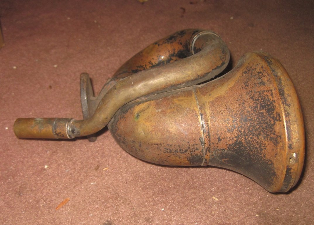 FS one rough unrestored "Rubes" brass horn, correct for 1914 (and possibly late 1913.) Lots of dents and dings, but the brass seems to be in decent shape and it should straighten without too much trouble. Asking $95 + shipping. Thanks for looking.