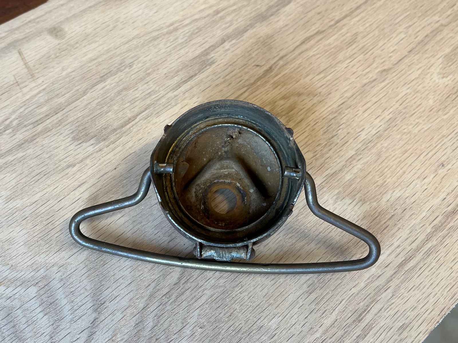Flip top brass radiator cap. Looks like it was nickel plated at one time. Needs some cleaning up, has some stress cracks on the sides.