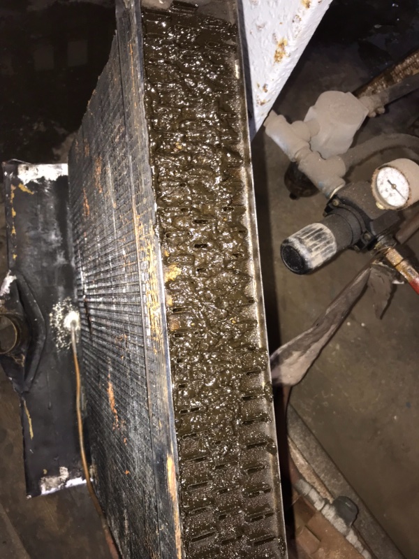 Years of sludge. Likely a leaky head gasket or two and who knows what other problems over the years. Over half the tubes were totally blocked .