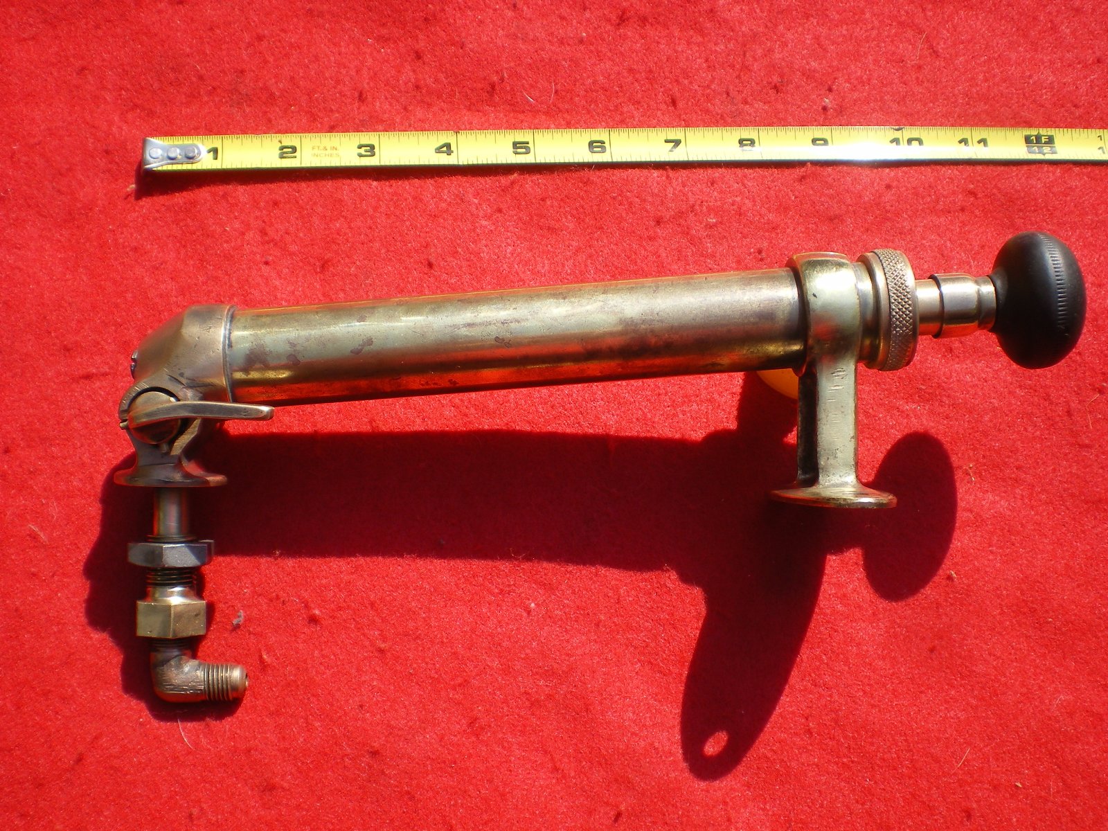 For Sale Brass hand operated fuel pressure pump. Great for brass speedster. Pump has a front port for an optional pressure gauge, currently has a threaded plug. Pump measures 10-1/2 inches in total length (Front plug to end of handle) and 1-inch in diameter tube. Shutoff valve operates smoothly. Comes with NOS leather cup (dry). Cup will need to be soaked in neatsfoot, regular or synthetic oil before installation. Not sure which oil is best. All threads are in good shape. Price $475. plus shipping. Call or text (248) 894-75fiveone. Thanks, Walt