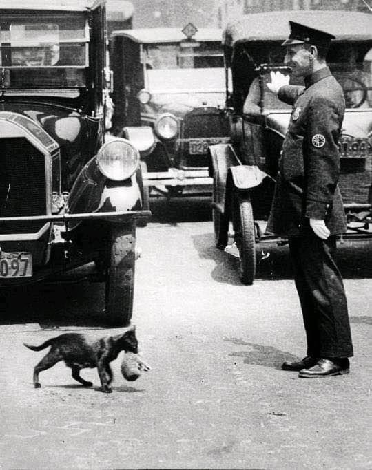 Hers a neat photo of a Model T sitting next to a high end rich man’s car in the late 20’s beings stopped in the street by a traffic cop. He’s trying to make it safe for the mother cat.