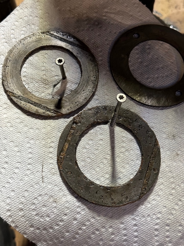But the biggest discovery was that the thrust washers, (pictured), were made of babbitt! We are so happy that we found this and can change them out to the bronze ones when we put it together again. Now de-greasing, cleaning and ordering the parts that we don't have at hand. So glad we opened her up and found those old thrust bearings.
