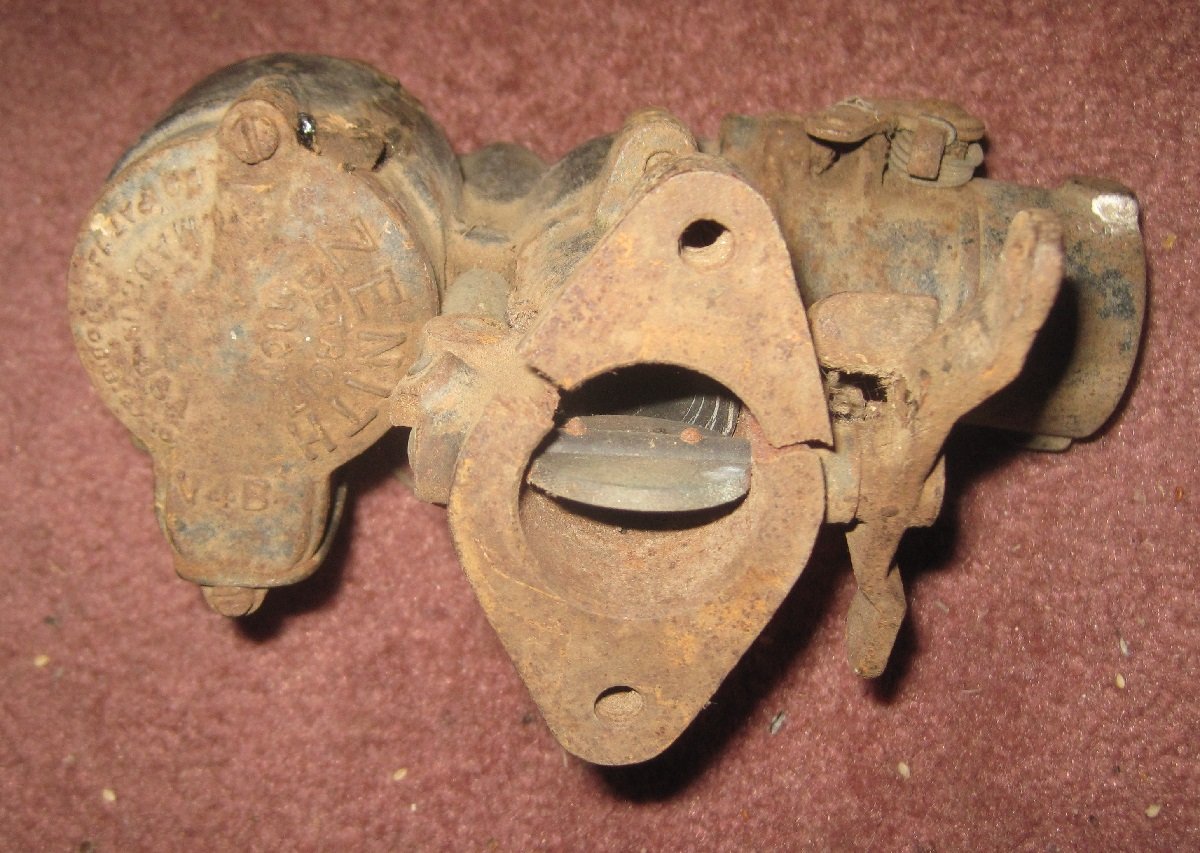 one cast iron Zenith V4B carburetor, that I believe originally fits a 1925 Chevrolet Truck. Sadly this carburetor has a cracked body caused by decay and expansion of the pot-metal venturi. As such this is a parts carburetor only. Free; you pay shipping.