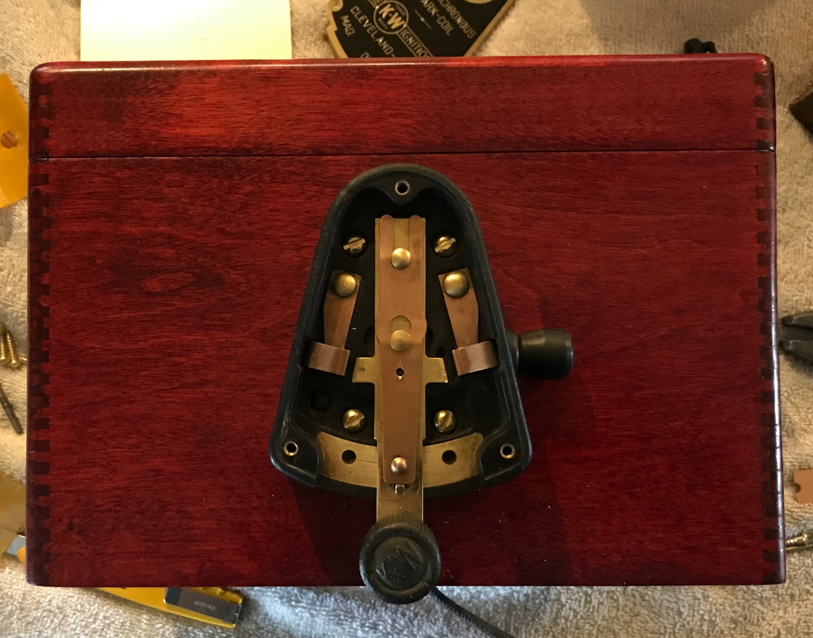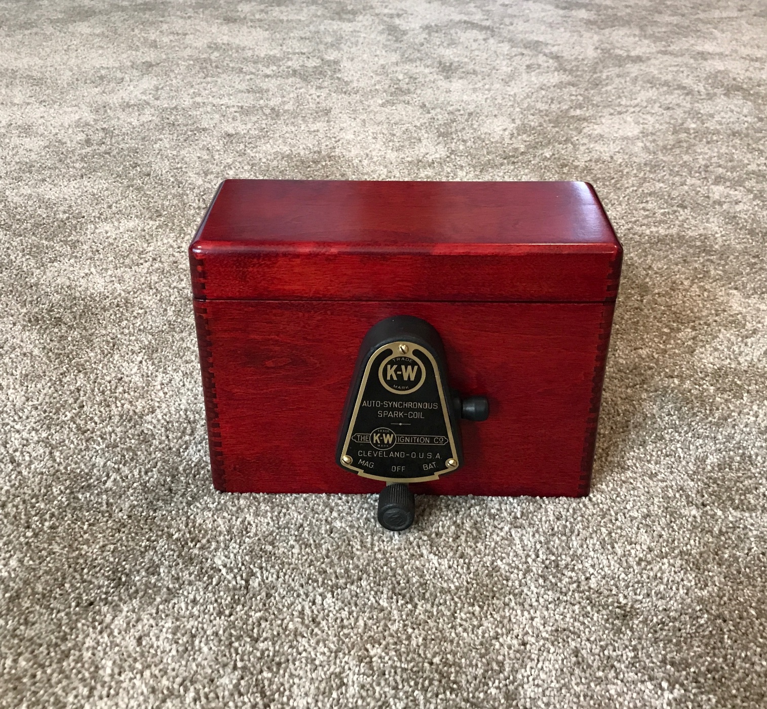 Reproduction 1912-13 slant top wooden coilbox. This coilbox is designed to hold the common later coils. It has a nice original 1913 KW switch, new faceplate, and new copper contacts, posts and insulators. New solid core wiring. It comes with two options for mounts, the installed and easily removed mounts that use 1/4 thread studs, and a pair of reproduction 5/16 thread traditional mounts are also included if you want to replace and install to your liking. The box is beautiful, with a rich stain and polyurethane. It is ready to mount and use. Perfect to replace the troublesome original coilbox and coils with a more reliable option with easily sourced coils for touring. 600 includes shipping.