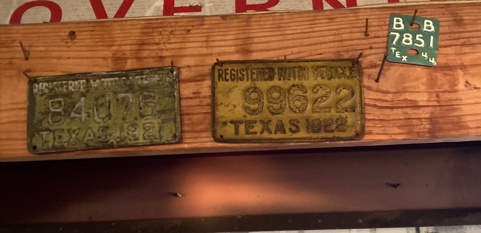 Pat, In this photo on the right is a Texas plate of the war years-1944. Also, 1921 and ‘22 plates.
