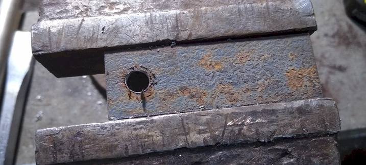 Drilled a 5/8" hole above the steering column for a rubber grommet and used a worn out grinding disc to de-burr both sides.