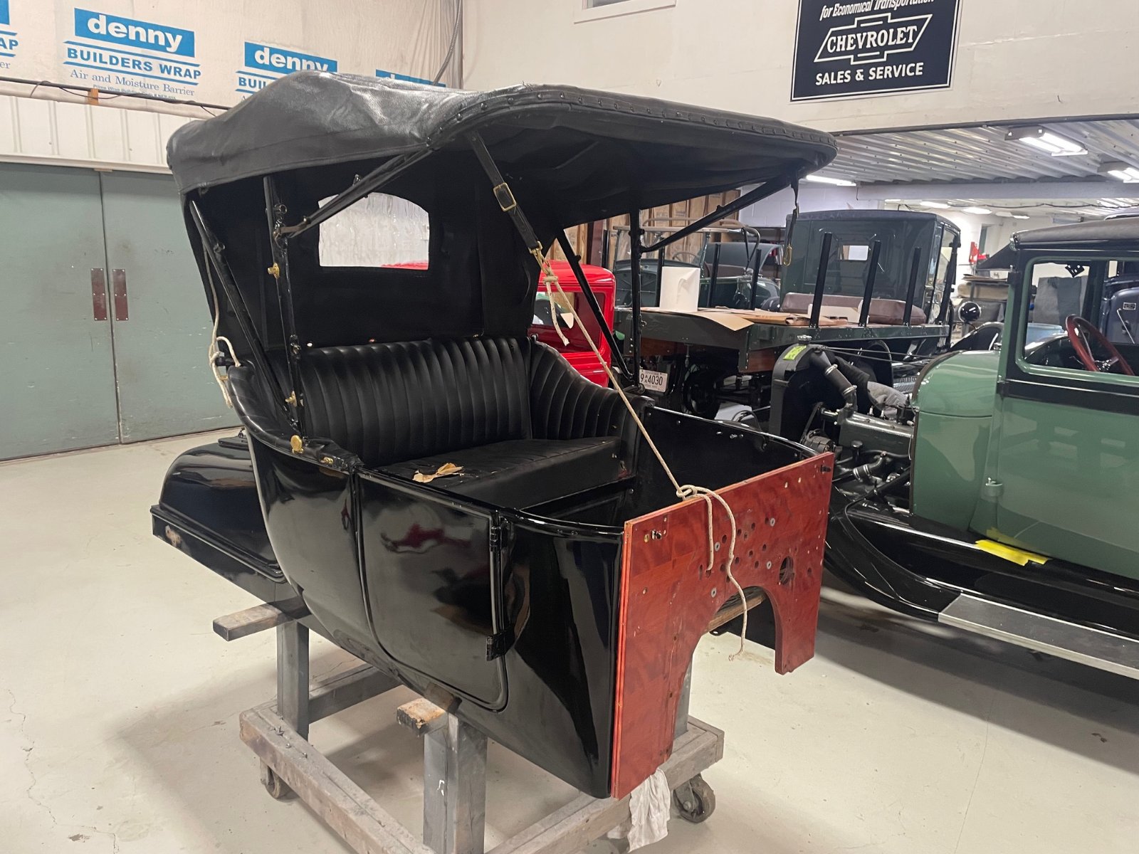 FOR SALE: 1914 Runabout Body w/ correct Turtledeck, nice Top Iron Sockets & Bows, Side Curtains, Interior upholstery, & correct Cherry Firewall. Very presentable as-is. (This car won Best Commercial Vehicle on the 2024 Cadillac MI tour. ) By my standards, the body Wood is approximately 50% which means it has some age but still has much life left. The door opens & closes as normal and does not fly open when driving. A new Top & Side Curtains were professionally sewn approx. one year ago. Seat cushion & backrest has torn places that are easily covered with a towel or blanket. Definitely functionable and useable as-is. Paint is shiny although it does have chips and flaws.