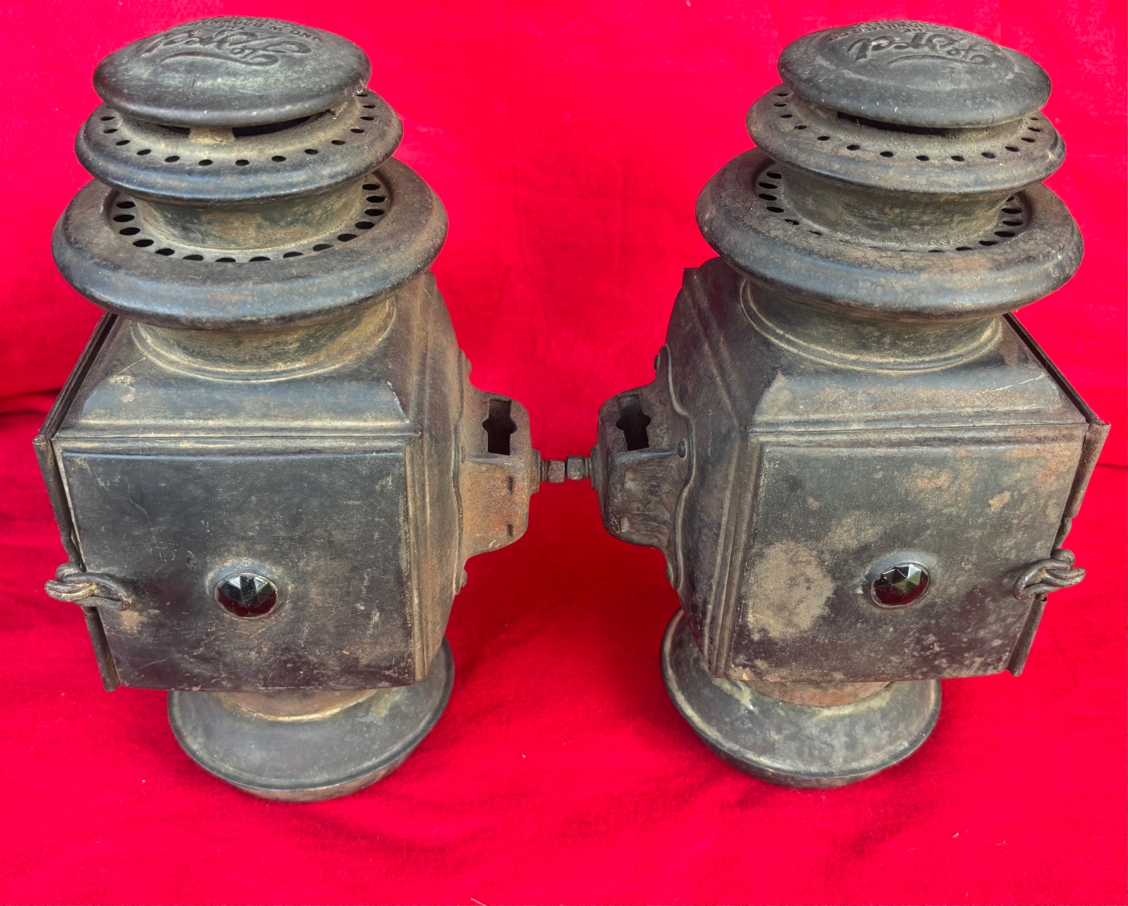 Here is a nice straight pair of unrestored Jno W Brown Side lights. One broken glass lens and a small pin hole in one oil tank. Correct for 1913 - 1914. $225.00 plus shipping for the pair
