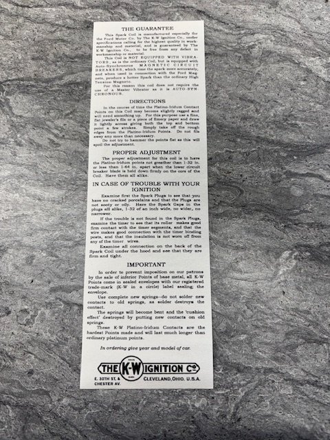 This package is a unique chance for a 1913 Model T owner to assemble and use the superior Williams designed ignition coils in and an original KW coilbox first used in production of 1913 Ford cars
