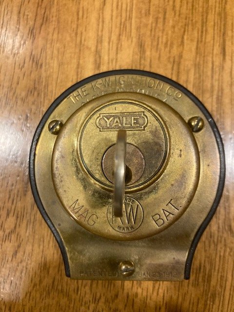 Pic of my KW coil box ignition switch. The internals are the same as Eds' master vibrator but the switch internal connection lever is designed to turn by the Yale/KW key versus the normal round ignition key. Nice switch Ed, the patent date on my switch is the same as yours. Also of note the internal tumbler of these switches have a serial number engraved on it that matches the serial number on the Yale/KW key.
