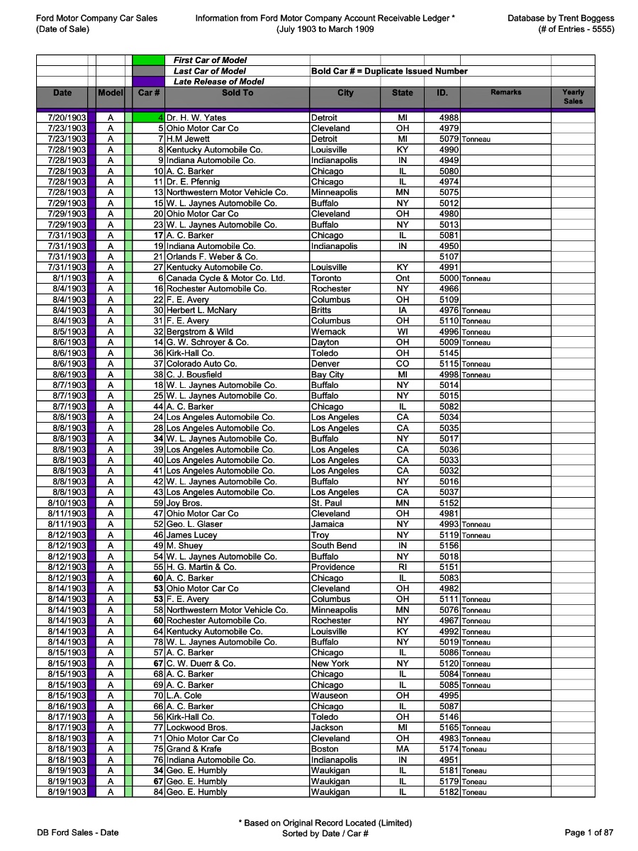 Another question is, what does the ID number to the right (shown on Trent’s database, but cut off on the two ledger pages) represent? The Yates car has the earliest entry date (date on the left, at the beginning of each ledger entry) of July 20, 1903. However, the Pfenning car has an earlier “ID” date, of July 13, but later ledger date of July 28, 1903. Is the “ID” number the day the order is received, and the number on the left the day the car was shipped? If so, which car is first, the one with an earlier “order” or the one “shipped” (or received)? One thing about it, once the first car went out the door, Ford Motor Company was off to the races, and never looked back. FMC Board minutes show the company began paying investor dividends before the end of 1903. Pretty remarkable for a start up, cash strapped business.