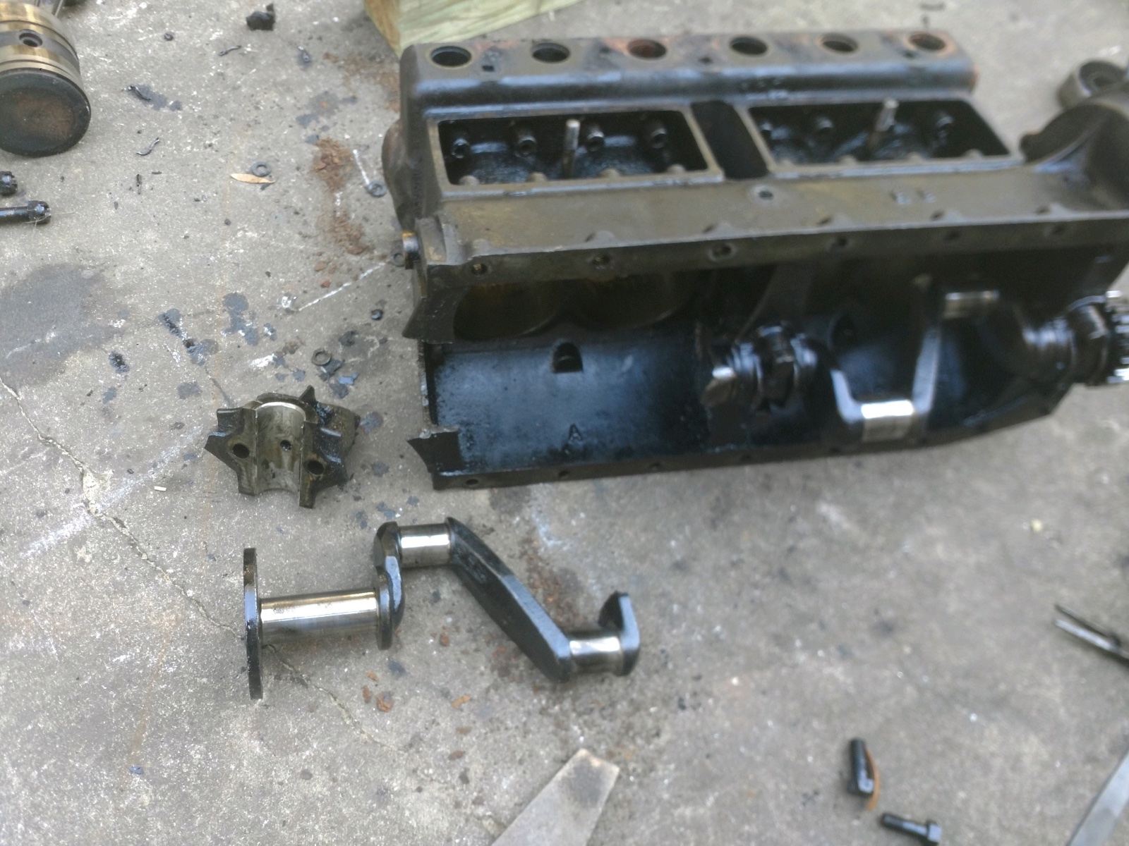 THE HUNK OF WOOD DID NOT CAUSE THE FAILURE, IT LOOKS LAMINATED , BAND WOOD IS NOT, CAN TELL BY LOOKING AT THE CRANK, ITS NOT SCORED ,IT DID NOT SEIZE, THE SPLASH SYSTEM WAS DOING ITS JOB, OTHER FORCES WERE AT WORK HERE,PERHAPS SOMEONE AT ONE TIME WAS DOING SOMETHING IN THE TRANSMISSION THAT NEEDED A PROP, AND THE WOOD FELL IN, THAT WOULD BE MY GUESS, THAT OIL TUBES JOB IS TO SUPPLY OIL TO THE FRONT OF THE ENGINE ON A EXTENDED 2 1/2 PERCENT GRADE. CAN YOU PLEASE TELL US, WERE YOU DRIVING ALONG--ENGINE UP TO TEMP,- OR JUST STARTING OUT,--THIS TYPE OF FAILURE DON'T TAKE PLACE SETTING IDLING, IVE HEARD OF IT HAPPENING WHEN STARTING,THE ENGINE, [WITH STARTER] BEING A 13 [NO STARTER]. THAT TAKES THAT OUT OF THE PICTURE, ABOUT THE BREAK IN THAT CRANK IS WHERE MANY OF THE FAILS' TAKE PLACE ON A --T--CRANK, MORE SO THAN ANY OTHER LOCATION, AND IT LOOKS TO ME IT WAS UP TO SPEED,BECAUSE OF THE DAMAGE DONE TO REAR MAIN, PERHAPS 25 OR SO MPH.IS YOUR ENGINE PRONE TO [FREE STARTS] ? HAVING WORKED ON STEAM LOCOS IN MY PAST THERE RODS WERE PRONE TO CRACKING TOO, NOT THE DRIVE CRANK BUT THE INNER CONNECTED TO THE WHEELS, WE HAD A SPECIAL HAMMER FOR THIS USE, HALF WAY BETWEEN THE PINS YOU WOULD WHACK THE ROD AND BY THE SOUND ONE COULD TELL BY THE REPORT ITS CONDITION, IF IT RANG LIKE YOU HIT A ANVIL- THINGS WERE GOOD ,A DEAD THUG IT WAS TEAR DOWN TIME, YOU CANT ALWAYS SEE THE PROBLEM , ON A --T--CRANK THERE IS SO MANY 0THER PARTS CONNECTED TO IT THIS TEST WONT WORK. MAGNAFLUX IS THE ANSWER, BUT THIS CANT BE DONE IN PLACE, --TRULY A SAD HAPPENING, PLEASE HANG ON TO YOUR DAMAGED BLOCK AND ALL THE PARTS, IT IS REPARABLE , THINK OF IT AS ONE OF A KIND,DO HAVE THE CRANK YOUR GOING TO USE MAGNAFLUX'D , SET IT ON A HUNK OF WOOD ON END,TAP IT WITH A HAMMER AND YOU WILL HEAR THE RINGING IT WILL MAKE IF ITS SOLID.GOOD LUCK IN YOUR REPAIR'S